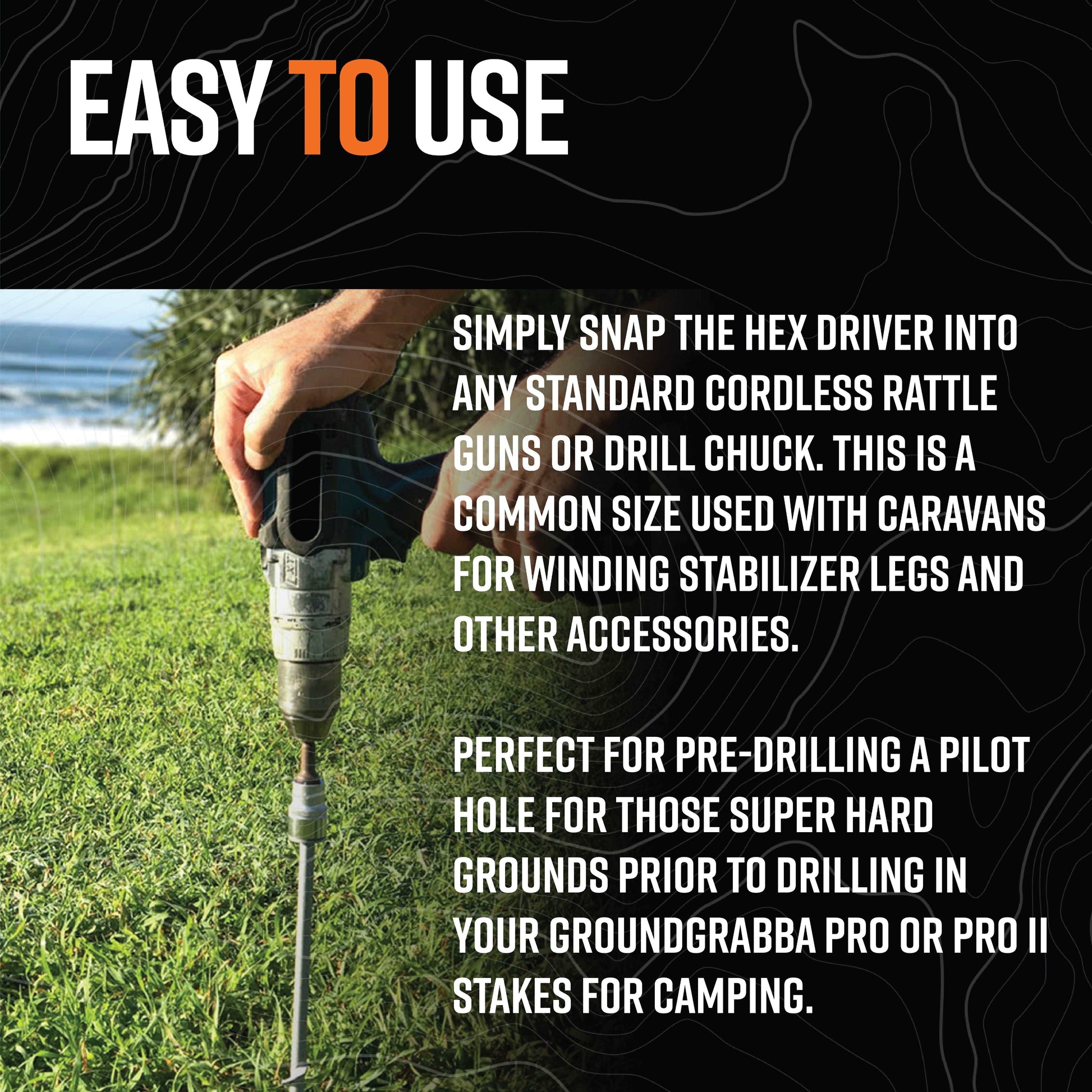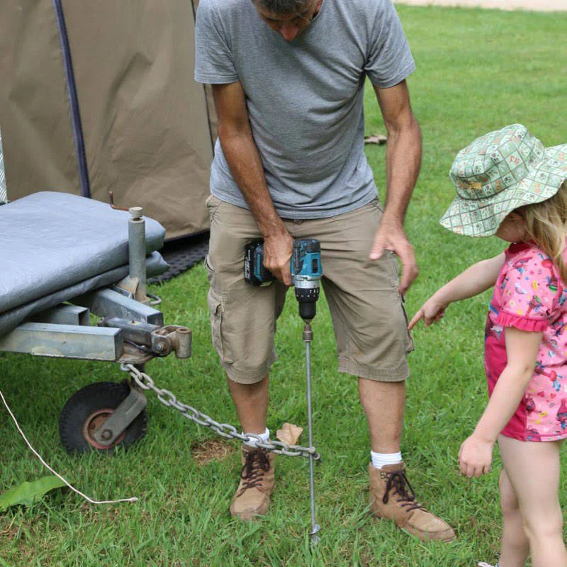 To make installation a breeze, pair your pegs with our custom 16mm Socket Driver — designed to work with most cordless drills. It’s the quickest way to get your GroundGrabbas in and out of the ground without breaking a sweat.