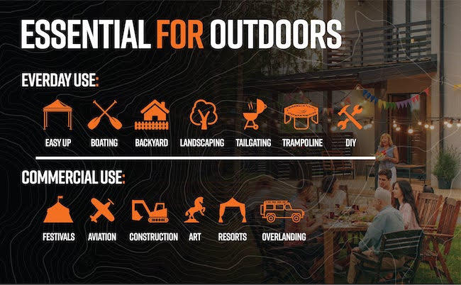 The Pro II’s aren’t just for camping! You can use them to secure your light aircraft, outdoor play equipment, securing outdoor and patio furniture, rigging lighting or staging structures for outdoor events or for permanently anchoring something in your yard. There’s so many uses for the GroundGrabba range. Got a question? Get in touch