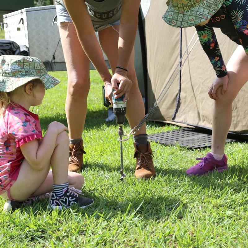 We know what you’re saying to yourself “I have to take a drill camping?” Well, no you don’t – our entire GroundGrabba range is designed to be manually screwed-in using a socket wrench or our HexHook Pro, however the very reason David designed them was to make life easier by letting another device, like your cordless drill, do the hard work! The type of drill we recommend to use with our tent pegs is a tradie-quality one, like the 18v Makita we use. It’s ideal to begin with it set at a low speed with mid-range torque. It’s always a good idea to test screwing-in your GroundGrabba’s and adjust the speed and torque to a suitable range for the ground type. Even better to play with them at home or out and about BEFORE you head off on your adventure.