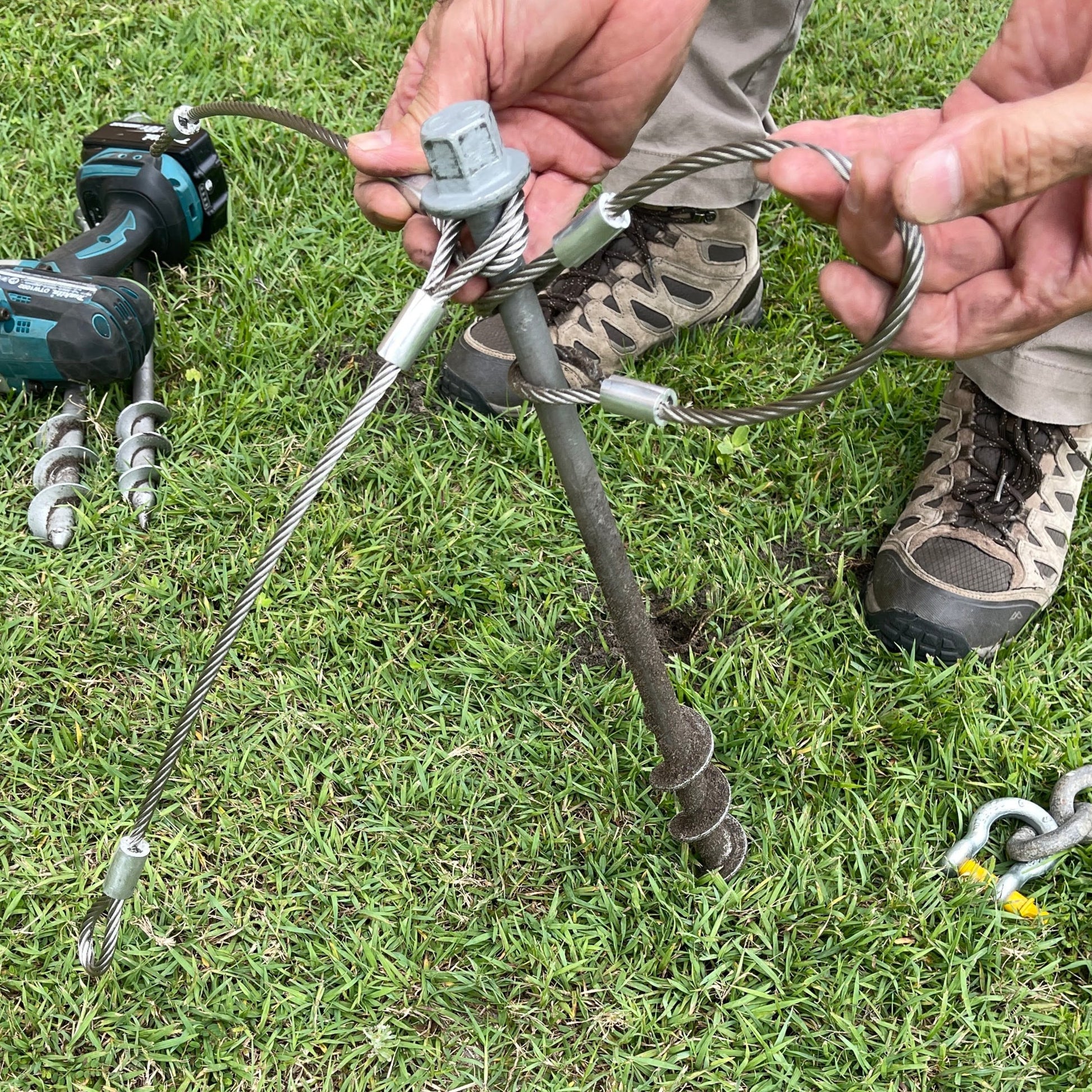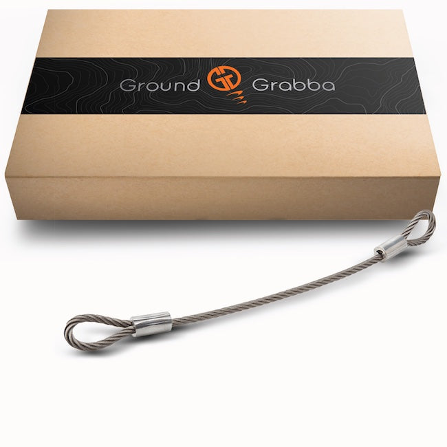 Simply loop the steel wire tie around the item you want to hold down, then screw/wind your GroundGrabba through the loop holes at each end of the wire, then deploy your GroundGrabba.