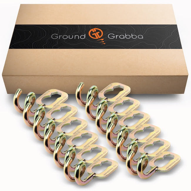 The Easter Camper Special 2 delivers a much larger anchoring system designed for campers running multiple tents, awnings, gazebos or larger campsite setups. With both GroundGrabba Junior and GroundGrabba Lite anchors included, you get a total of 24 screw-in ground anchors ready to secure multiple tie-down points around your campsite.