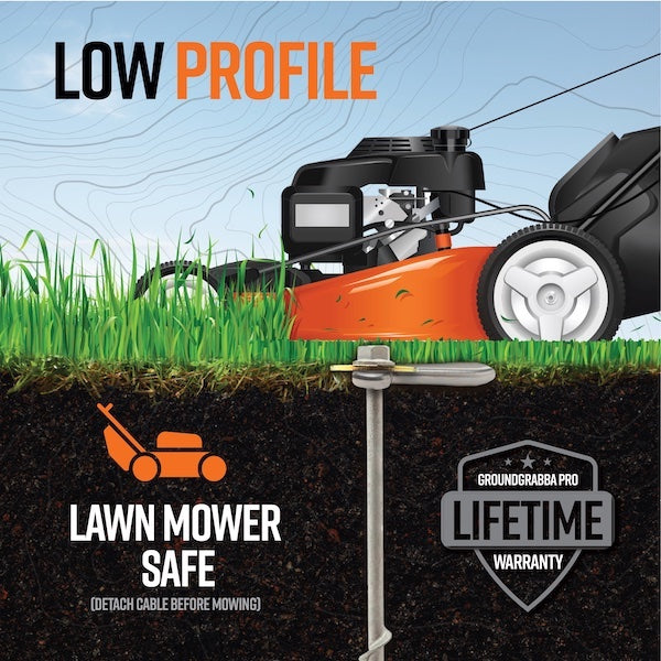 - Connect the tether – One end of the cable has a metal loop only. Use the included carabiner to attach this end to the GroundGrabba anchor, securing it under the hook washer.