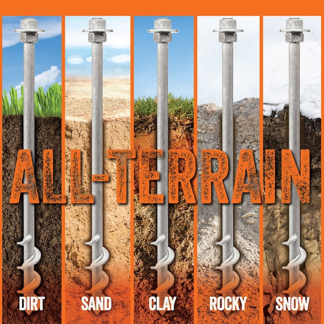 | Lite | 400mm | 19mm hex | 3/4 length spiralled flights | Light-duty in sand & soft to medium-to-firm soils; can work in grass-topped sand if used correctly; not for heavy loads or hard/rocky ground. Cordless drill use — not to be used with impact tools |